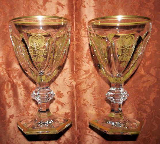 – Pair of heavy crystal Baccarat goblets hand painted in 24 carat gold. 300€ the pair. (New today cost nearly 600€ each)