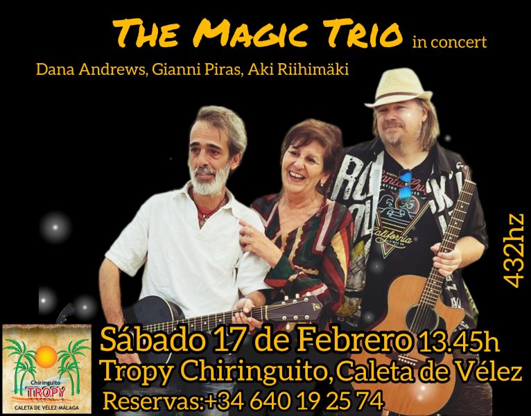 – Saturday 17 February at 2.00pm. The Magic Trio: Dana Andrews vocals, Gianni Piras acoustic guitar, Aki Riihimäki electric guitar, will perform at Tropy, Caleta de Vélez. Info/booking +34 640 19 25 74