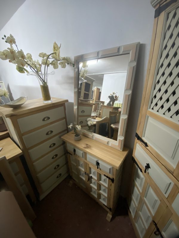 – Pine sideboard Natural wood (waxed) Beige color New bronze handles Measurements 130 x 39 x 80cms Price 195€
