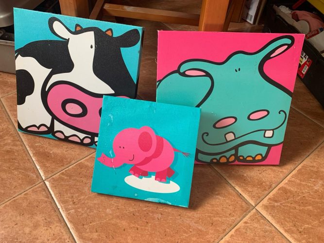 – 3 children’s computer printed paintings on canvas. Two 28 cm x 28 cm x 2 cm and the small one: 20 cm x 20 cm x 2 cm. 8 euro