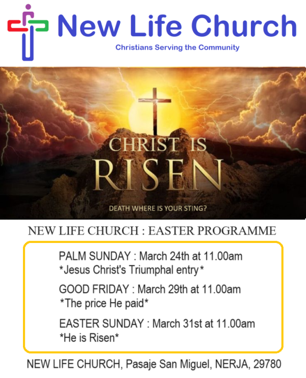 New Life Church: Whether you live in Nerja or are visiting our area, you are very welcome to come and join us at our Sunday gathering. Join us for a time of Holy Spirit led worship and experience the presence of our God. Our teaching is Bible based as we honour God and obey His Word. During this time of uncertainty, God’s Word reminds us that the Gospel shines brightest in times of darkness. Our service lasts for about 1 hour and 30 mins. With Tea and Coffee afterwards.