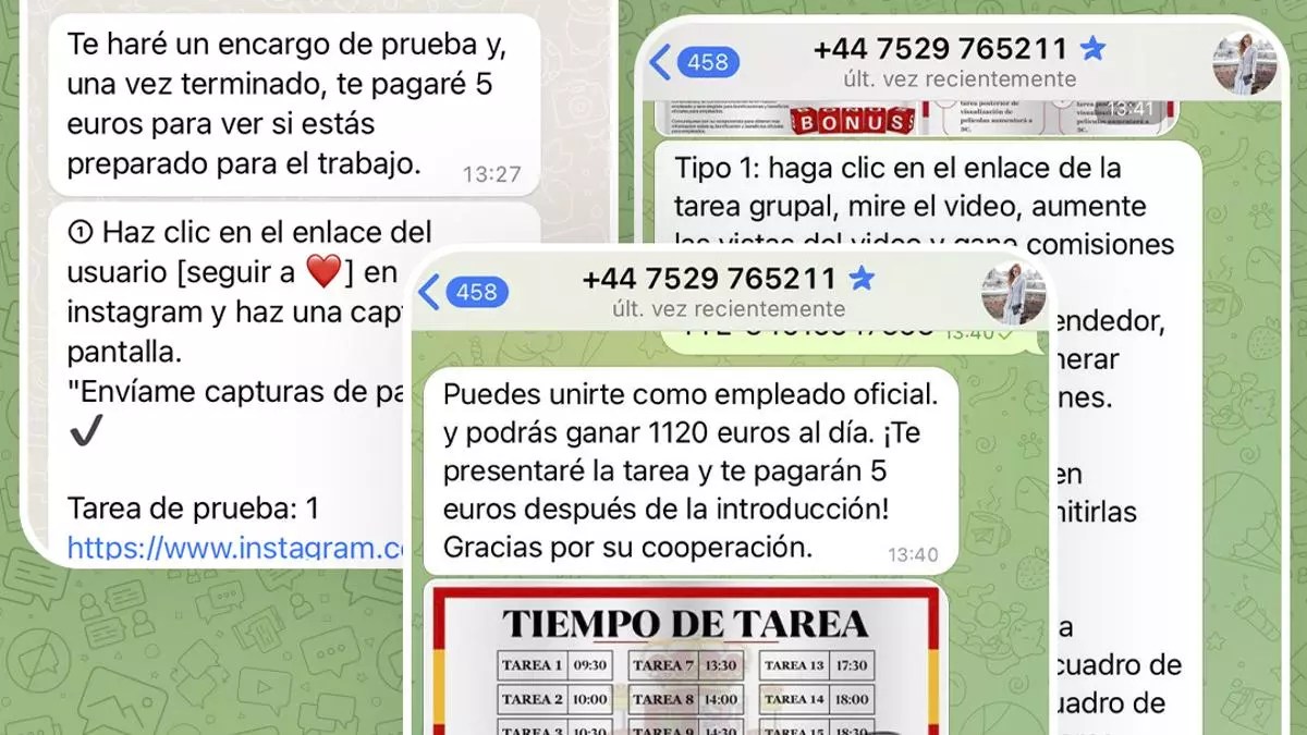 – Here is an example of a scam offer: “We work with Instagram companies that are willing to pay for more exposure, so our company needs to hire a lot of employees. I’ll give you a test assignment and, once finished, I’ll pay you five euros to see if you’re ready for work. You can earn between 50 and 600 euros or more a day. Are you interested in working with us?” Source, Spanish: https://www.eldiario.es/tecnologia/timo-gusta-arrasa-whatsapp-hay-victimas-han-perdido-18-000-euros-48-horas_1_11226223.html