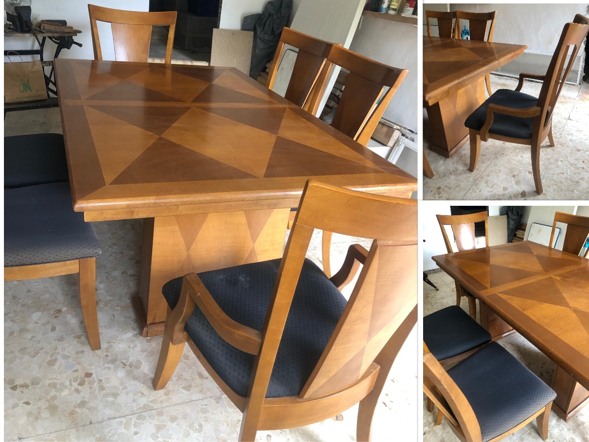 For Sale: American maple dining table 175×110 extends to 225×110 plus 4 matching chairs and two carver chairs with black seats and a set of new cream seats. Very good condition €250. Buyer collects. Contact Sue, Nerja