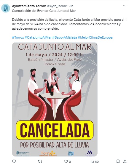 Due to the forecast of rain, the Cata Junto al Mar event scheduled for 1 May 2024 has been cancelled. We regret the inconvenience and thank you for your understanding. Source: X (Twitter)