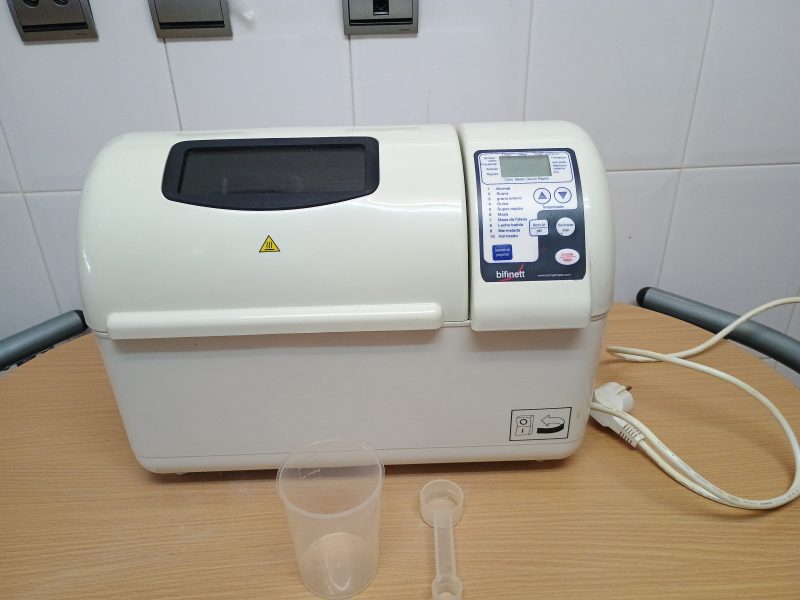 – Fully automatic bread-maker, complete with récipes, measuring cup and spoon, in pristine condition, 20€.