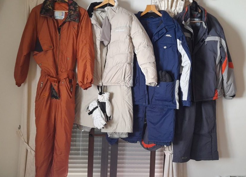 – 4 Snow Ski suits, the cream one and the blue one was worn once (size 10 and ML). The gold one and the grey one worn twice (14 and extra large), some with gloves, glasses and hats all like new. 75 euros for 4 or 25 euros each.