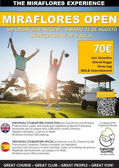 The €70 ticket includes a 9:30am shotgun start, green fee and shared buggy, BBQ with entertainment and prizes for most jokes on the course as well as a the best golfers on the day. Info & tix: https://www.mirafloresgolf.es/open2024