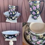 – Vintage Bowl & jug no cracks or chips but black paint rubbed off in places jug height 30cms price 25€