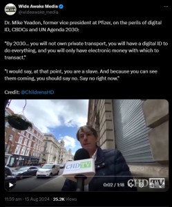 – “By 2030… you will not own private transport, you will have a digital ID to do everything, and you will only have electronic money with which to transact.” “I would say, at that point, you are a slave. And because you can see them coming, you should say no. Say no right now.” Source: X Link