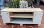 – Solid wood low tv unit with shelf and 2 cupboards Natural wood (waxed) Beige color New bronze knobs Measurements 150 x 47 x 61cms Price 160€