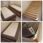 – IKEA Single Beds, 90 x 200cms. Two “Espevaer” slatted wooden bed bases and legs and “Malfors” foam mattresses. The mattresses and bed bases are unmarked and in excellent condition; only used as guest beds. The grey Espevaer covers can fit over the wooden bases – see the IKEA website, or as we have them to cover the mattresses. [https://www.ikea.com/nl/en/p/espevaer-slatted-mattress-base-with-legs-dark-grey-s59208084/]