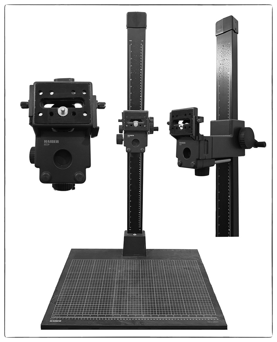 For Sale: A rare Kaiser RS10 Copy Stand with RTP Camera Arm for professional photographers and film makers. Non-reflective matte gray base board with printed fine grid and inch/cm scale; matte black anodized aluminum section tube column with inch/centmetre scales. The various individual parts move smoothly to ensure stability, fine adjustment and ease of use. In great condition and fully functional. Price €225.