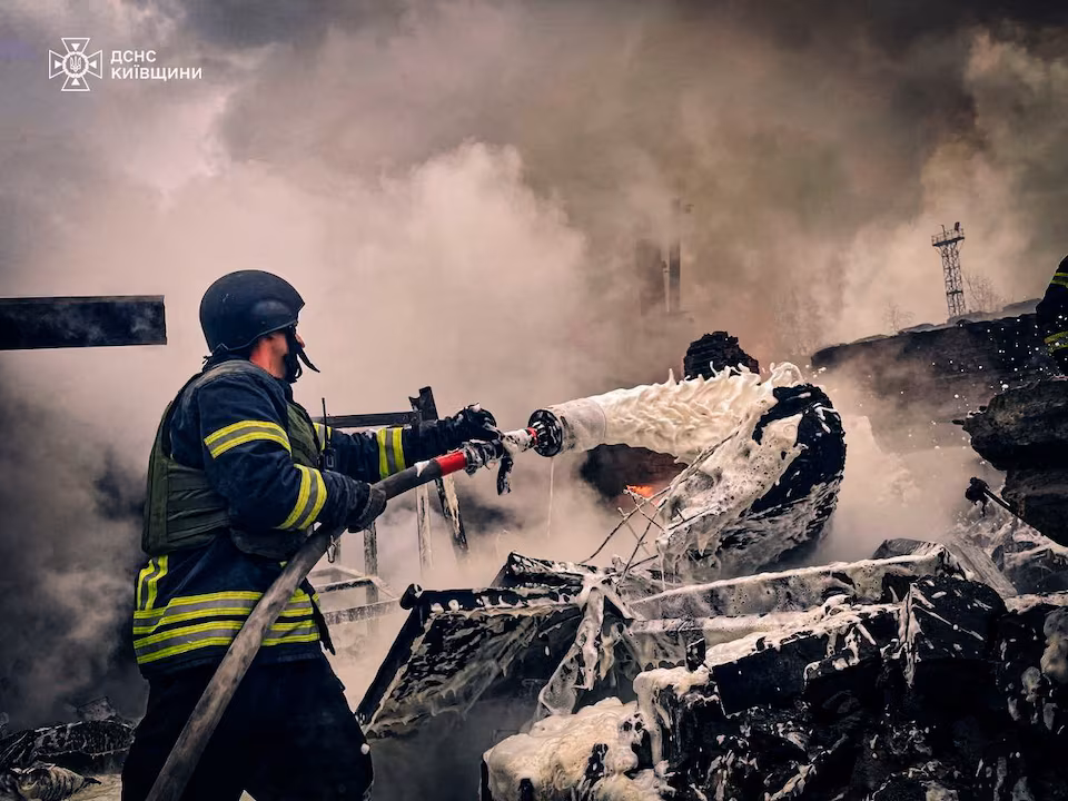 Falling debris came down in the region outside Kyiv, injuring a 48-year-old man and causing a fire at a warehouse, the head of Kyiv region’s administration said.