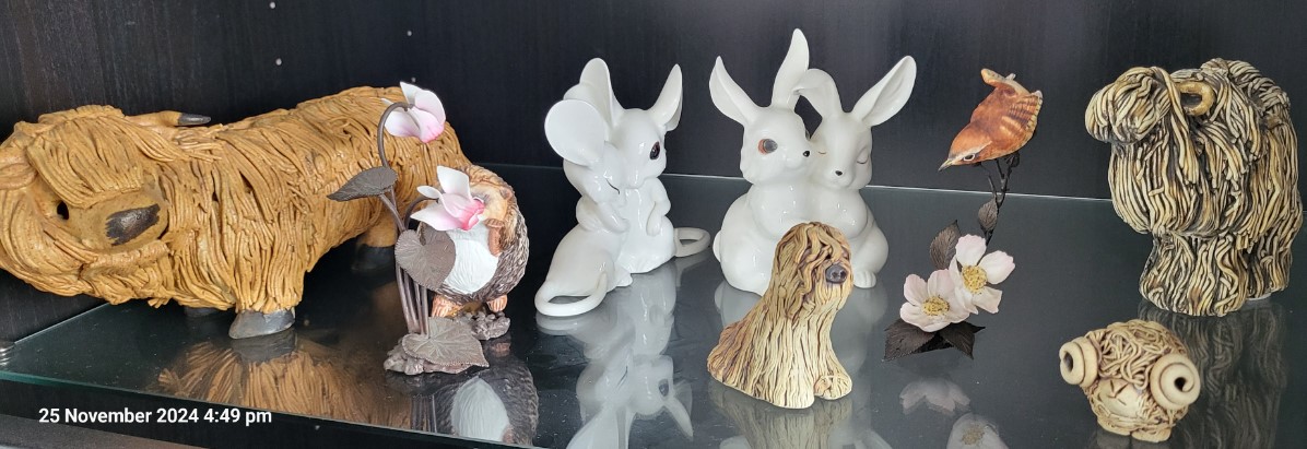 Highland Cow, 2 Mice (Royal Osborne), Wren, Hedgehog, Camel, Dog, Ram