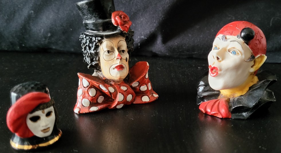 – Set of 3 Clown Heads – 2nd hand ornaments 3-6 cm high. 20 euros for all.