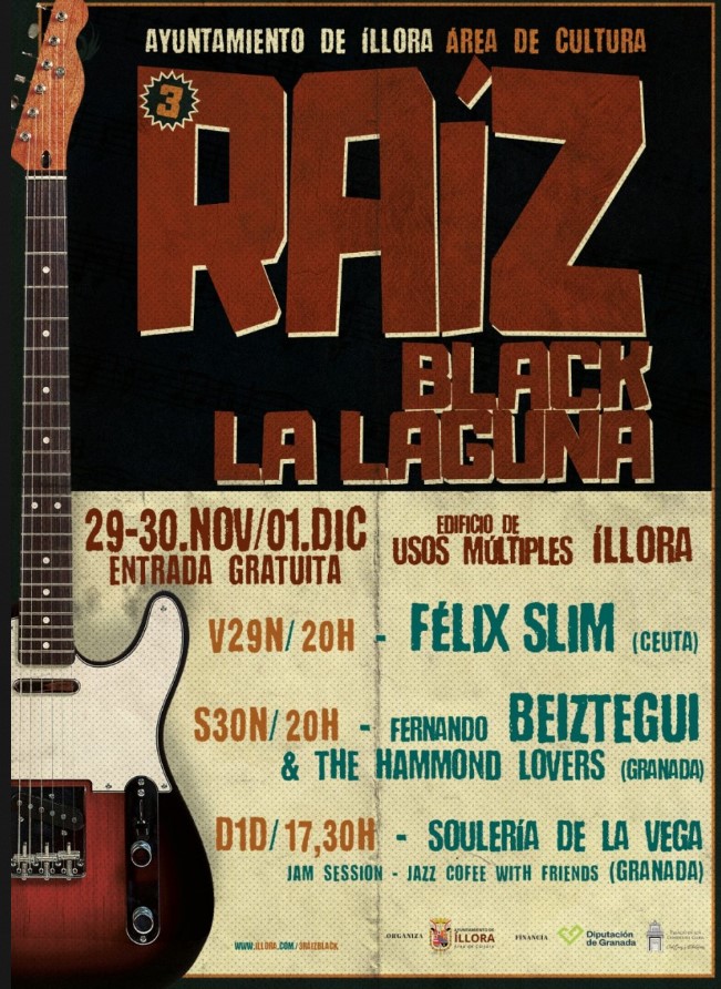 – The town of Íllora hosts the third edition of the Raíz Black La Laguna festival on the last weekend of November, with the participation of two blues greats- Felix Slim from Ceuta on Friday, 29Nov, 8pm. The next night it’s Fernando Beiztegui from Granada (Video Link), accompanied on this occasion by The Hammond Lovers, Saturday, 30Nov, 8pm.