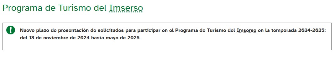 – After the end of the regular application period last July, the Institute offers a new possibility to pensioners who have been left without a place. Specifically, the application submission period has been opened from November 13 to May of next year. Source, Imserso website, Spanish: https://imserso.es/espacio-mayores/envejecimiento-activo/programa-turismo-imserso
