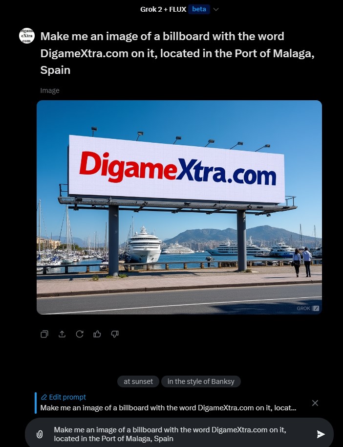 Then I refined my AI prompt to, “Make me an image of a billboard with the word DigameXtra.com on it, located in the Port of Malaga, Spain”. This was the result. It figured out the clever word colors on its own. Spooky, right? Other free AI tools I tested are not nearly as good as GROK. I’m told the competing, “premium” paid AI tools do come close to GROK in some aspects, but require you to install apps and pay a subscription.