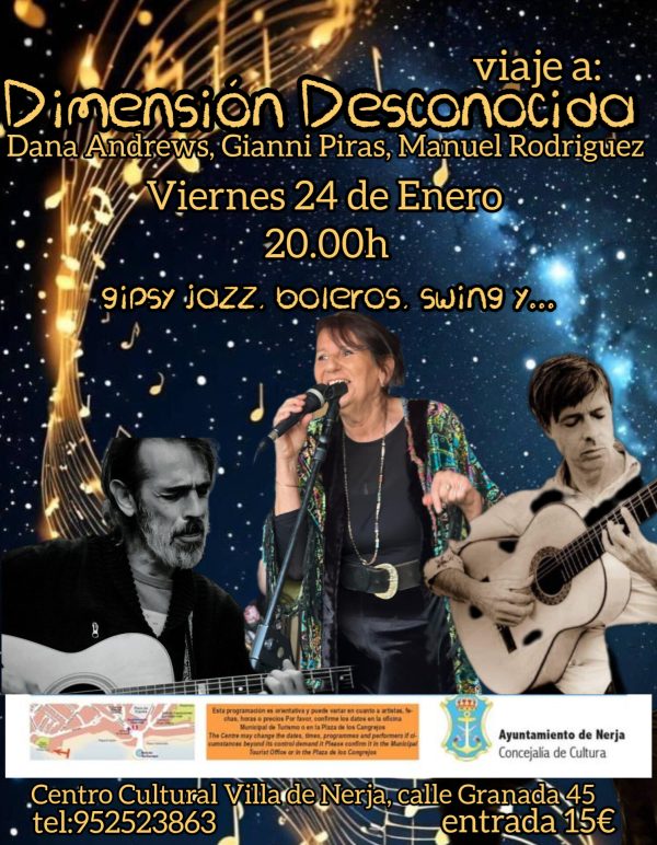 Dana Andrews on vocals, Gianni Piras on acoustic guitar, & Manuel Rodríguez on flamenco guitar. Special guest: Kali Parkin, double bass. They offer a repertoire that alternates moments of great rhythm with others that are more introspective, with the warm notes of the bolero. A guitar with a lot of rhythm and swing, like few others, presents the ideal base for an improvisation of a guitar that expresses the colors of flamenco, of gypsy jazz, all enriched by the soft but incisive voice used as an instrument by Dana Andrews. A unique opportunity to enjoy these musicians that take us to an unknown dimension.