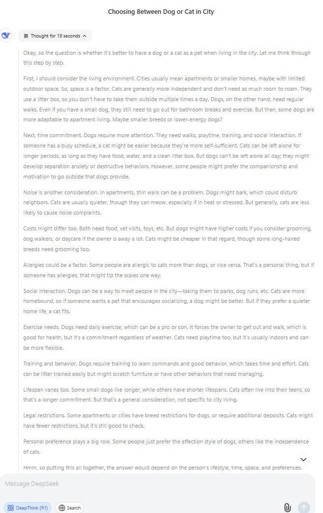 – One major component of the new Deepseek that sets it apart from OpenAI’s ChatGPT, GROK, Apple Intelligence & META AI, is its exposed “reasoning engine”, the logic-chain used to determine the final answer in plain English. Each step in the logic chain that Deepseek AI follows to create its reply to your prompt is shown in the reply as a preface. You can follow the logic chain to confirm that not only the facts, but also the reasoning, is acceptable to you. Other AIs only provide a few links to sources it used, but you have no idea how it developed the answer it provides, so it is hard to verify the accuracy of answers.