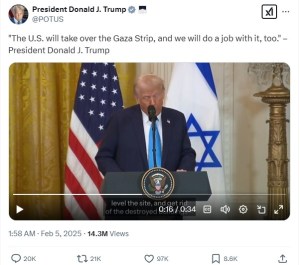 – “We’ll own it and be responsible for dismantling all of the dangerous unexploded bombs and other weapons on the site, level the site, and get rid of the destroyed buildings – level it out and create an economic development that will supply unlimited numbers of jobs and housing for the people of the area.” Full article: https://nypost.com/2025/02/04/us-news/trump-says-us-will-take-over-the-gaza-strip-after-relocating-all-palestinians/ & X Link