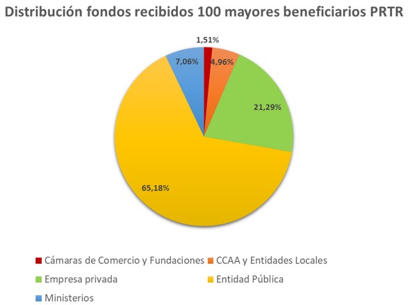 – This list includes what the European Commission considers to be the final recipient, that is, the last vehicle to receive funds under the recovery mechanism. Therefore, the list reflects the top 100 public and private entities that carry out investments financed with European Next Generation funds. According to the latest published data, the public sector has received 77.2% of the funds awarded to the top 100 beneficiaries. Of the almost 9,850 million euros distributed, 6,417 million went to public entities, 488 million to Autonomous Communities and Local Entities and another 695 million to different ministries, leaving only 21.29% for private companies.