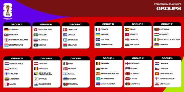These are the 12 groups of four or five teams each that are part of the UEFA preliminary round for the 2026 World Cup: