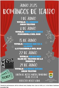 Theatrical performances will be offered every Sunday in June, at 8:00 p.m., in the María Zambrano Assembly Hall.