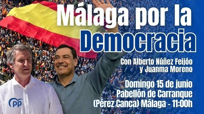 – Specifically, the demonstration called by the Andalusian Popular Party will start at 11 a.m. this Sunday, June 15, at Málaga’s Carranque Pavilion under the slogan “Andalusia for Democracy.” “This Sunday you have an appointment in Málaga to defend democracy,” announced the PP of Andalusia on its official X account, with a poster confirming the attendance of the president of the Andalusian Popular Party and the national leader of the PP. Source, Spanish: https://www.libertaddigital.com/andalucia/2025-06-10/feijoo-y-juanma-moreno-convocan-una-nueva-manifestacion-contra-sanchez-en-malaga-7264230/