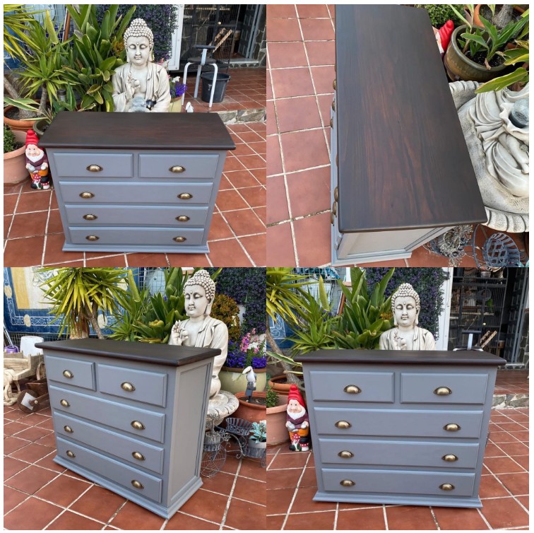 – Pine chest of drawers. Solid pine top Bronze handles Dark stain top Grey color Measurements 90 x 39 x 77cms. Price 140€