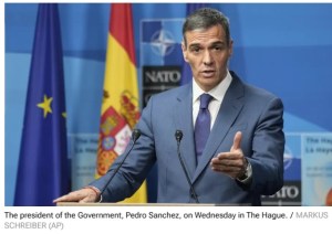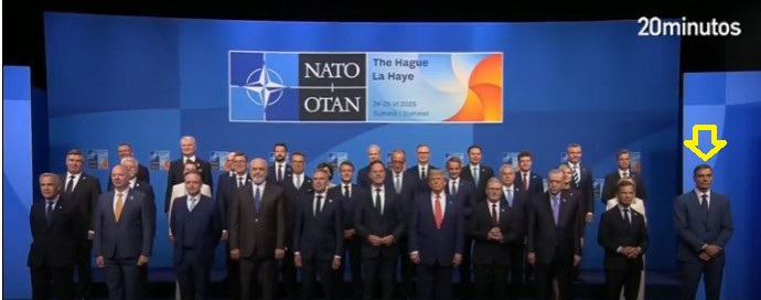 – Spanish Prime Minister Pedro Sánchez once again stood apart from other international leaders in the group photo taken at the NATO summit in The Hague on Wednesday. In the photo taken the previous day, Sánchez had already distanced himself from US President Donald Trump, and they were also seated at different tables at the dinner hosted by King Willem-Alexander and Queen Máxima of the Netherlands, amid controversy over the 5% increase in defence spending. Source, Spanish: https://www.20minutos.es/internacional/sanchez-nuevo-alejado-resto-los-lideres-foto-familia-cumbre-otan-haya-5725342/