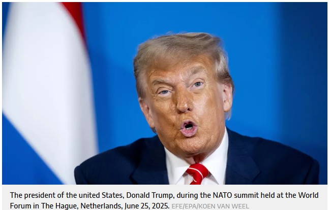 – Trump responded to the agreement between Spanish Prime Minister Pedro Sánchez and NATO Secretary General Mark Rutte: “It’s the only country that won’t pay the full amount; they want to stay at 2%. I think it’s terrible. You know, their economy is doing very well, but that economy could disappear with a single stroke of the pen if something bad were to happen.”