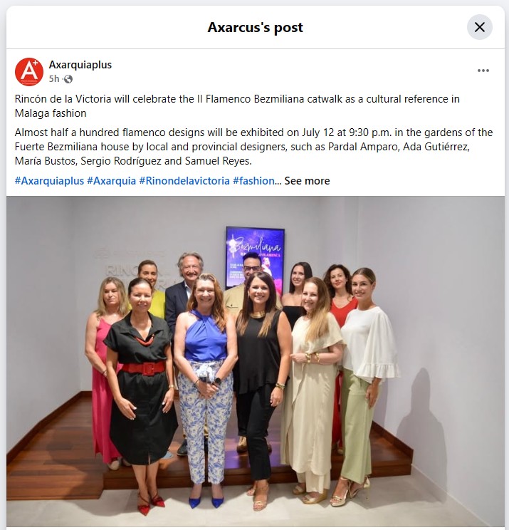 Almost half a hundred flamenco designs will be exhibited on July 12 at 9:30 p.m. at the catwalk in the gardens of the Fuerte Bezmiliana house by local and provincial designers, such as Pardal Amparo, Ada Gutiérrez, María Bustos, Sergio Rodríguez and Samuel Reyes. Info: https://www.rincondelavictoria.es/noticias/-/asset_publisher/2UsKbRfNBL22/content/id/1041759