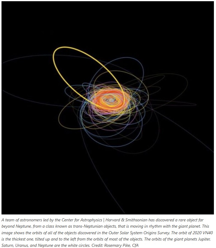 – Way out past Neptune, astronomers have spotted a rare space traveler, a trans-Neptunian object named 2020 VN40. Using the LiDO survey, led by the Center for Astrophysics, Harvard\Smithsonian, the team discovered that this icy wanderer isn’t just drifting, it’s moving in sync with Neptune, completing one orbit around the Sun for every ten Neptune makes.