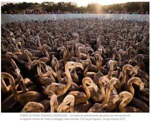 – The operation began at dawn, with non-flying chicks guided into enclosures, then fitted with metal and plastic rings, measured, weighed, and released. Nearly 400 volunteers, along with expert ringers and scientists, carried out the task in just three hours. The collected data will help track the birds’ breeding, migration routes, and use of wetlands across the Mediterranean and northwest Africa. Over the past decades, more than 20,000 flamingos have been ringed here, making the event a cornerstone of wetland conservation in Andalusia. The Andalusian Wetlands Network is crucial for integrated, ecosystem-based territorial management. Source, Spanish: https://www.europapress.es/esandalucia/malaga/noticia-anillan-600-pollos-flamenco-laguna-fuente-piedra-malaga-registra-22700-nacimientos-2025-20250809134410.html