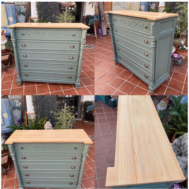 – Solid pine chest of drawers serenity color bronze handles natural too waxed 130 x 51 x 122cms price 275€.