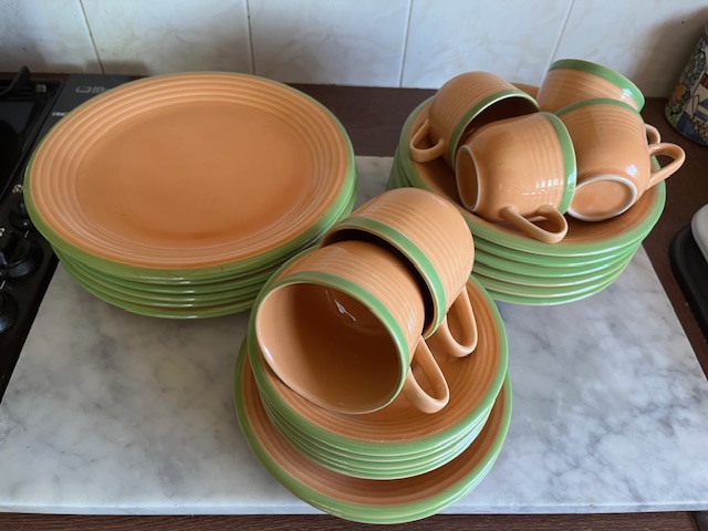 6 Cups; 6 Saucers; 3 Tea plates; 6 Dinner plates; 6 large bowls. 50€ for all