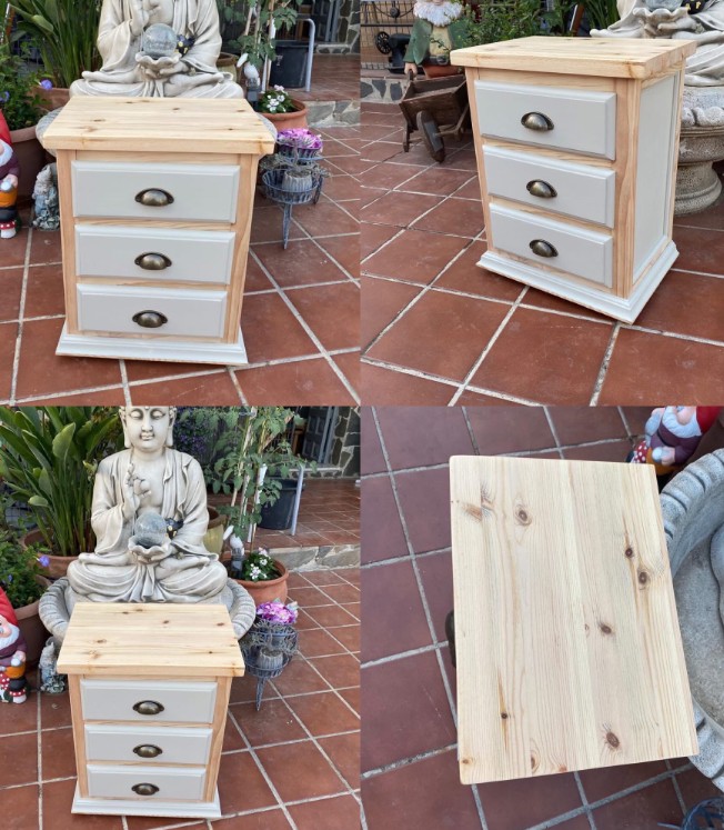 – Solid pine bedside table, replacement solid wood top, waxed bronze handles, beige color, 45 x 32 x 58cms price 70€.