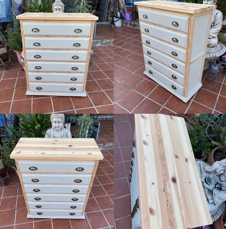 – Solid pine chest of drawers ,new solid wood top waxed bronze handles, beige color, 80 x 38 X 102cms price 160€.