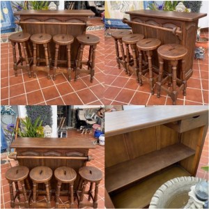 – Wooden bar with drawer with 4 matching solid wood bar stools, vgc, 133 x 45 x 110cms approx extra 15cms width with bar, price 160€.