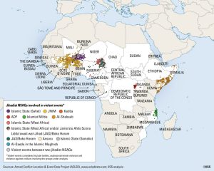 Africa has emerged as the principal theatre of jihadist activity, with the Sahel at its epicentre. The Africa Center for Strategic Studies estimates nearly one million square kilometres of populated land lie outside state control, roughly twice the size of Spain. Burkina Faso’s military junta controls only 40% of the country. While territorial control is not the primary aim of these groups, some, notably the Al Qaeda affiliate JNIM, are positioning themselves as alternative governance structures. JNIM, responsible for over 80% of jihadist-related deaths in the Sahel, has expanded its operational capacity to threaten the capitals of Mali, Burkina Faso and Niger using drones, improvised explosives and coordinated assaults.