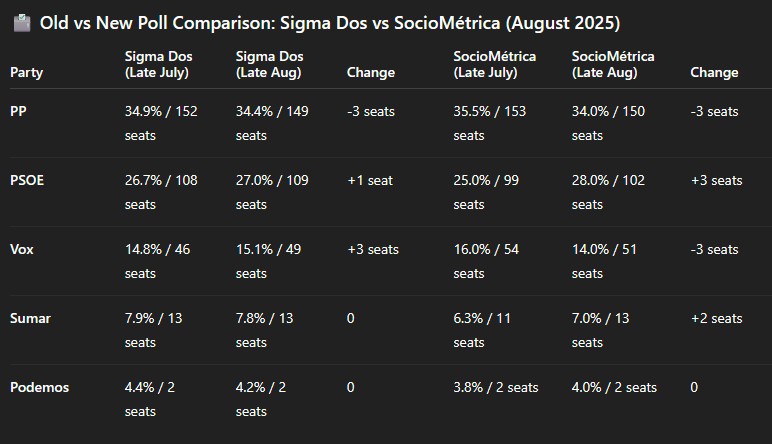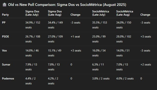 Source, Spanish: https://www.libertaddigital.com/espana/politica/2025-09-01/el-psoe-se-recupera-poco-vox-sigue-subiendo-y-el-pp-cae-en-agosto-pese-a-la-mayoria-absolutisima-de-la-derecha-7290157/