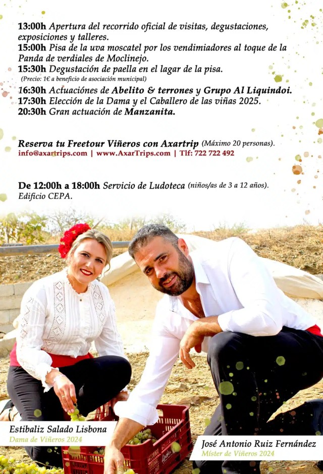 – The official program for the 2025 Viñeros Festival will begin early in the morning with Holy Mass to bless the grapes, accompanied by the voices of the Aires de la Axarquía Choir.