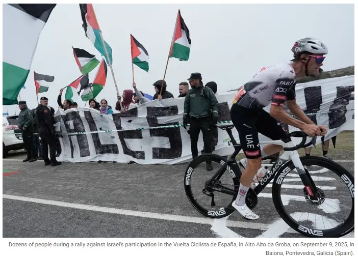 – The demonstration was held at Alto de San Cosme, where the civic group Plataforma Cívica Vigo Pro-Palestina gathered from 16:30 on Tuesday, arguing that La Vuelta “whitewashes genocide” by allowing the participation of the Israel Premier Tech team. Hundreds of people shouted slogans such as “La Vuelta sponsors genocide in Palestine,” “Europe sponsors, Israel kills,” “This is not a war, it is genocide,” and “Palestine will win,” criticising the participation of the Israeli team in the race.