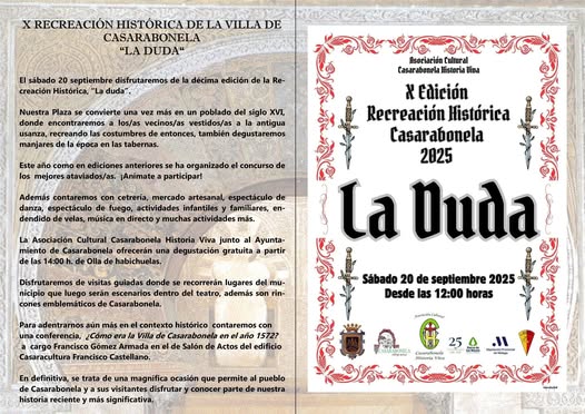 The day will begin at 12:00 p.m. with a Inaugural Parade from the library car park to the Villa de Casarabonela, which will officially open its doors half an hour later. Among the planned activities are Vintage Games, exhibitions of falconry with birds of prey, a free bean stew tasting, guided tours of emblematic places, family workshops and children’s activities such as the “Treasure Hunt 1560”. There will also be shows of contemporary and aerial dance with fire and lectures on local history. At 9:00 p.m. the Historical Reenactment “La Duda”, inspired by the events that occurred in the mid-sixteenth century.