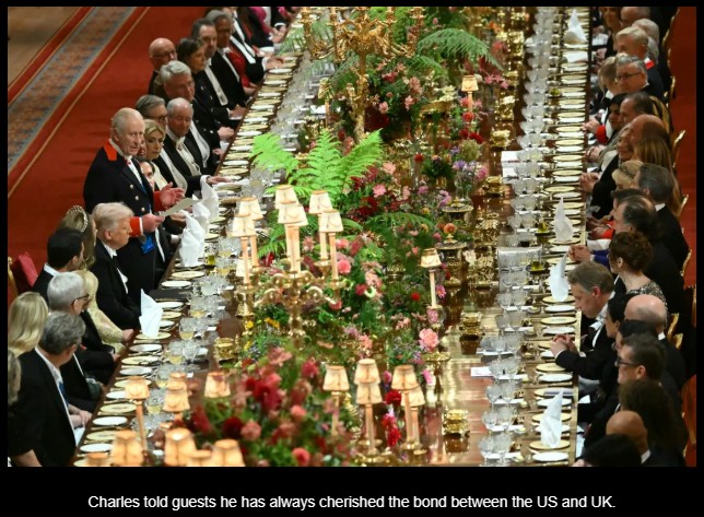 – Trump, 79, spoke beneath heraldic shields and knights’ armour in St. George’s Hall, where he was positioned at the centre of a banquet table between Charles, 76, and Catherine, Princess of Wales, who is recovering from cancer treatment. First lady Melania Trump, glowing in a bold yellow Carolina Herrera dress with a lilac belt, was seated nearby between Prince William, his father’s heir, and Queen Camilla.