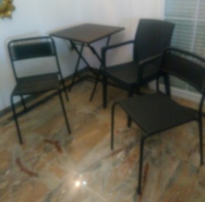 For Sale: Folding rattan table and three Rattan chairs – one armchair and two others. Price 35 euros