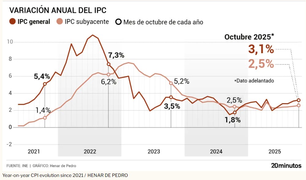 – Electricity prices surged as the 21% VAT rate returned in January 2025 and wholesale prices jumped by 58% from September to October. Rail fares increased due to reduced transport subsidies, still in place until year-end. Analysts from Funcas expect inflation to fall towards 2% by early 2026, aligning with central bank targets. The ten-month average suggests pensions will rise about 2.6% next year, slightly less than 2025’s 2.8%. Overall, the data confirm renewed inflationary momentum despite forecasts of moderation in the coming months. Source, Spanish: https://www.20minutos.es/lainformacion/economia-y-finanzas/inflacion-repunta-ligeramente-hasta-3-1-octubre-se-situa-maximos-16-meses_6662720_0.html