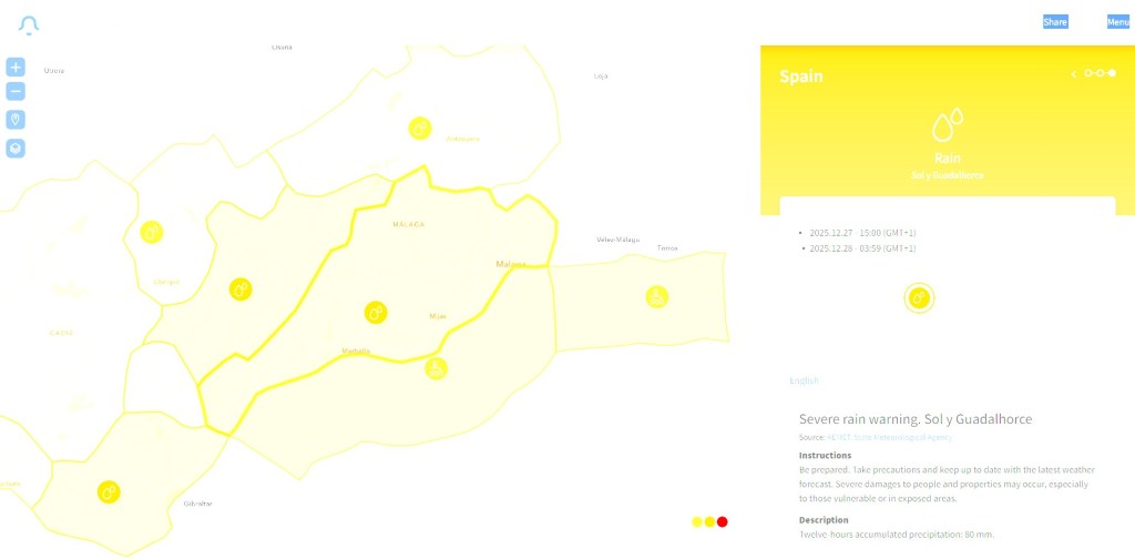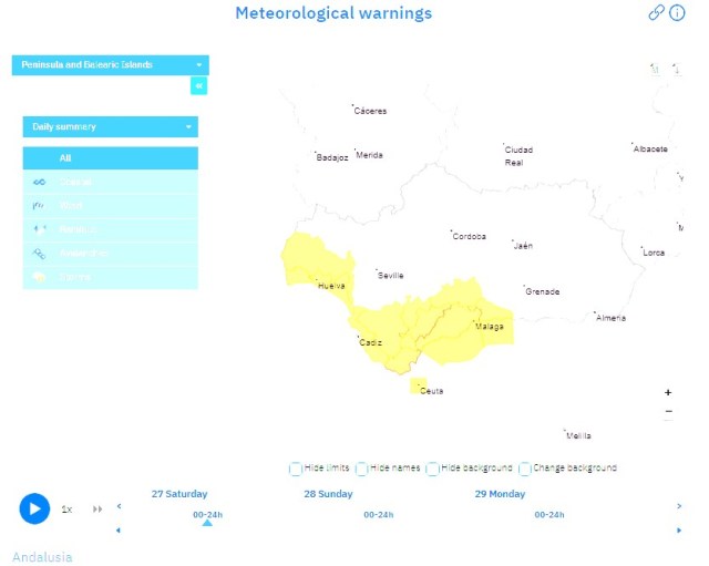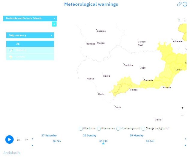 Here are the weather alerts for Saturday & Sunday from the official AEMET website. Click on them to see more clearly. https://www.aemet.es/en/eltiempo/prediccion/avisos