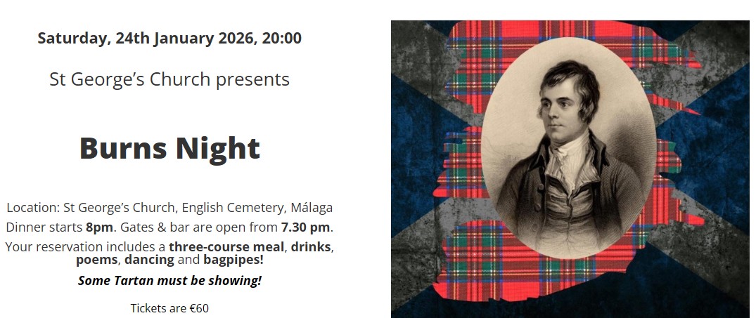 The bar will open at 7.30pm and dinner will be served at 8pm. Tickets cost 60 euros. Info, map & tix: www.stgeorgesmalaga.com/events